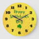 A clock with a Happy St. Patrick's Day design written in a trendy green font. A green clover underneath the text. The background is a refreshing golden beer texture with big droplets.