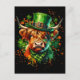 Cute Highland cow dressed up for St. Patrick's Day in a hat and scarf with shamrocks.