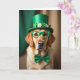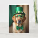 This card shows a golden dog in a tight, centered close-up, looking straight at you with soft, trusting eyes that feel like a friendly hello 💚. It’s dressed for St. Patrick’s Day in coordinated green accessories that give it a sweet, dressed-up charm. An emerald top hat sits on its head, trimmed with small white daisies with yellow centers and scattered shamrocks ☘️. Thick-rimmed bright green glasses rest neatly on its snout, adding a slightly studious look that pairs nicely with the dog’s warm expression. A shiny green bow tie is snug at the neck, as if the pup got ready for a special date or a close friend’s party. The fur is painted in rich golden tones with visible softness, set against the sharper shine of the hat, glasses, and bow tie. The greeting text sits near the top in light lettering that stands out against the darker side of the background. Behind the dog, the backdrop splits from deep forest green on the left into sandy taupe on the right.