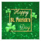 Elegant golden glitter glamourous St. Patrick's Day illustration featuring 3d gold typography inside a gold glitter border with classy shamrock clover on a precious green background.