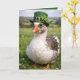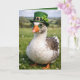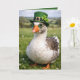 A goose, sporting a small St. Patrick's Day hat with a four-leaf clover and glasses, stands in a grassy field beneath a clear sky.