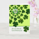 Feliz dia de San Patricio! Happy St. Patrick's Day greeting card written in Spanish. A floral arrangement of clover / shamrock leaves with a white clover bloom in the centre of the arrangement. Inside message translates as "Good luck today and forever." Art, image, and verse copyright © Shoaff Ballanger Studios, 2021.