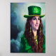 A young lady with brown hair wearing green clothes and hat. This is a AI generated art.