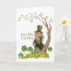 Fun Leprechaun holding a bouquet of shamrocks looking Love Sick. He is in the forest where Leprechauns live. Inside says "May your Shenanigans be many" in a fun font. Matching envelope, return address label and envelope seal also available.