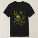 This is a black t-shirt with St. Patricks Day dark green motifs. This artwork features a lively collection of classic St. Patrick’s Day icons arranged against a deep green background. At the center sits a frothy mug of green beer, surrounded by playful shamrocks in various sizes, a golden horseshoe, a leprechaun hat with a shiny buckle, a gold coin stamped with a shamrock, and warm-toned hearts in brown and gold. The elements feel cheerful and celebratory, creating a festive, good‑luck‑filled atmosphere.