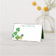 This folded name place card is shown in white with a festive St. Patrick's Day leprechaun clovers print and has a green colour inside to it.