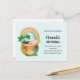 Birthday invitation with an adorable illustration featuring a smiling green and gold pot with a cute rainbow,
