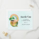 Save the date postcard with an adorable illustration featuring a smiling green and gold pot with a cute rainbow,