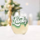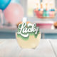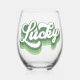 This fun stemless wine glass features retro style script that says "Lucky" in a distressed green and white font. Perfect for celebrating St. Patrick's Day!