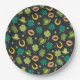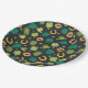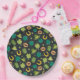Cute St. Patrick's Day patterned party plates in festive green, orange, yellow and off-black feature a fun, crazy pattern of four leaf clover shamrocks, lucky horseshoes, leprechaun hats, green beer and orange Irish kisses. A perfect compliment to your corned beef and cabbage at St Paddy's Day parties!