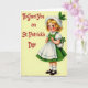 This card shows a vintage-style scene of a cherubic little girl with golden curls peeking out from under a bright white hat topped with a green bow. Her blue eyes, rosy cheeks, and gentle smile feel like she’s greeting someone she cares about, like a close friend or a favorite relative. She wears a rich green pinafore over a white blouse with puffed sleeves, finished with a ruffled white apron that adds a soft, old-fashioned touch. Tucked in her left arm is a small white woven basket brimming with green shamrocks, giving the picture a fresh St. Patrick’s Day focus ☘️. Along the left side, the message “To Greet You on St. Patrick’s Day” is set in ruby-red lettering that stands out clearly. The background is a warm, buttery yellow that makes the green outfit and shamrocks pop while keeping the scene gentle and cozy 💚. The girl stands centered on the card, with the red text aligned vertically to her left and the basket of shamrocks angled slightly forward.