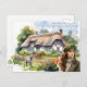 St. Patrick's Day postcard featuring a watercolor illustration of a charming Irish cottage with a thatched-roof, white exterior with green shudders and wooden beams surrounded by a colourful Irish country garden. A large Irish Wolfhound stands prominently near the entrance. In the bottom right foreground, a young Irish woman wearing a green flat cap, a tweed jacket, and a light scarf, evoking a traditional Irish countryside look.