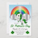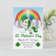 Festive holiday invitation for St. Patrick's Day or any Fantasy-Irish-themed birthday or event with a unicorn Pegasus with a green mane, tail, and hoofs and a shamrock on its hip. Sky background with a rainbow.