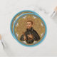 St. Peter Claver (1580-1654) was a Spanish Jesuit priest and missionary. In 1610, St. Peter volunteered to serve in the New Kingdom of Granada in the Americas, which encompassed present-day Panama, Colombia, and Venezuela. There he worked for forty years ministering to slaves upon their arrival at Cartagena, a major hub in the Transatlantic slave trade, and on the plantations in the neighbouring countryside. His tireless efforts not only to convert the slaves to Catholicism by preaching Christ crucified but to ameliorate their sufferings earned him the epithet “Slave of the Africans”. + Here St. Peter is shown clad in Jesuit garb—a black cassock and collared cape. He holds a simple brown wooden cross and a crown of thorns, symbols of Jesus as “a man of sorrows and acquainted with grief” (Isaiah 53:3). The image is enclosed in an inner frame reminiscent of a Gothic eight-petalled rose (or wheel) window; the corners of the simple, square outer frame are filled with heraldic thistles. + St. Peter Claver died on 8 September 1654 of natural causes after a long illness. He is patron saint of Inter-racial justice, African Americans, African missions, slaves, and the Republic of Colombia. + Feast: September 9 + Image Credit (BK 058): Antique image of S[aint] Petrus [Peter] Claver, S.J., originally published in chromolithography by B. Kühlen, Mönchengladbach, Germany, unnumbered Jesuit Series, late 19th century, from the designer’s private collection of religious ephemera. + Feel free to change colours!