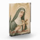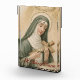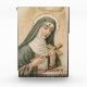 Wife, Mother, Widow, Nun—St. Rita of Cascia (1386-1457) experienced many stages of life. Life, however, had a way of putting her between a rock and a hard place. For this reason, she is venerated as patron saint of lost and impossible causes. Devoted to Christ’s Passion, she received a partial stigmata at the age of sixty: a chronic wound in the forehead as if from a crown of thorns that bled for the next fifteen years. It is her principal attribute. + Feast: May 22 + Image Source (M 015): Antique image of St. Rita [of Cascia] from a 1904 devotional print in chromolithography originally published by A. & M. B. [Albrecht & Meister of Berlin], Germany. From the designer’s collection of religious ephemera.