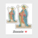 In this full-length portrait from a late 19th-century devotional print, St. Thomas Becket is depicted true to his earliest type: He is depicted in his prime: tall, slim, and clean-shaven. He holds his archiepiscopal cross in his right hand and carries a lectionary or Gospel book in his left. He is garbed in nearly full canonicals, that is, he wears a red dalmatic over a white tunic accessorised with red-violet gloves and a bright blue mitre. Presumably, he is also wearing on his feet that just peek out from beneath his robe buskins (ceremonial silk stockings) over his episcopal sandals (low shoes resembling slippers or modern loafers). He lacks only the requisite pectoral cross and ring. (The omission of a ring is a common artistic oversight.) A bright blue cope with yellow-green lining completes the ensemble. And, then, there is the unusually placed sword which pierces his mitered head from side to side…. + Throughout much of history, the sword has been the primary defensive and offensive weapon. Many saints—both male and female--have swords as attributes. In one two-volume iconographical study of some 1000 saints, a sword is associated with more than 15% or 150 of them! The sword is such a prevalent attribute that its presence alone is usually insufficient for pinpointing a given saint’s identity. + Context helps. Some saints, such as royal saints, carry a sword as a symbol of secular power. Other saints, soldier-saints, wield swords as a symbol of their profession. On rare occasions, some saints even carry two or three swords with varying significance attached. But, mostly, saints with swords are red martyrs, that is, saints who died for the Faith. + Most commonly, the sword signifies death by beheading. In narrative art, the execution itself may be portrayed. In single figure compositions, the Saint usually holds an unsheathed blade at his or her side point downward or shouldered point upward. The sword’s placement depends on whether the figure in question is full-length and standing or half-length as in a headshot. In more graphic renditions, the sword may be lodged in the head medially, wedged at the back of the neck, run through the throat, or piercing the heart or another of the body’s parts. + St. Thomas Becket’s martyrdom by four sword-wielding assassins began to be portrayed shortly after his death (See M 030). The indoor setting at an altar, the number of assassins with their respective heraldic bearings, and the presence of his cross-bearer are sufficient to differentiate Becket’s martyrdom from that of most other saints. The rare depictions of his decraniation leave little room for doubt of who is being portrayed. Less distinctive, however, were Becket’s first “portraits”. Of little interest iconographically, such representations routinely depict him merely as archbishop with no other emblems, identification being made through accompanying inscriptions. Gradually, Becket’s portraits were provided with a sword (See M 033) and head wounds (K 34). The same study mentioned in the first paragraph lists some 35 saints who were bishops or archbishops associated with a sword. Only one--with the possible exception of the lesser-known St. Theodard of Maastrict--however, is depicted mitered with a sword running through his head from side to side: St. Thomas Becket. It is by far and away the most popular way to represent the Saint today. + St. Thomas Becket is patron of secular clergy. + Feast: December 29 + Image Credit (P 005): Figure extracted from an antique image of St. Thomas Becket from a late 19th-century devotional print in chromoxylography, originally published by Friedrich Pustet, Regensburg, New York, and Cincinnati. From the designer’s private collection of religious ephemera.