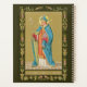 In this full-length portrait from a late 19th-century devotional print, St. Thomas Becket is depicted true to his earliest type: He is depicted in his prime: tall, slim, and clean-shaven. He holds his archiepiscopal cross in his right hand and carries a lectionary or Gospel book in his left. He is garbed in nearly full canonicals, that is, he wears a red dalmatic over a white tunic accessorised with red-violet gloves and a bright blue mitre. Presumably, he is also wearing on his feet that just peek out from beneath his robe buskins (ceremonial silk stockings) over his episcopal sandals (low shoes resembling slippers or modern loafers). He lacks only the requisite pectoral cross and ring. (The omission of a ring is a common artistic oversight.) A bright blue cope with yellow-green lining completes the ensemble. And, then, there is the unusually placed sword which pierces his mitered head from side to side…. + Throughout much of history, the sword has been the primary defensive and offensive weapon. Many saints—both male and female--have swords as attributes. In one two-volume iconographical study of some 1000 saints, a sword is associated with more than 15% or 150 of them! The sword is such a prevalent attribute that its presence alone is usually insufficient for pinpointing a given saint’s identity. + Context helps. Some saints, such as royal saints, carry a sword as a symbol of secular power. Other saints, soldier-saints, wield swords as a symbol of their profession. On rare occasions, some saints even carry two or three swords with varying significance attached. But, mostly, saints with swords are red martyrs, that is, saints who died for the Faith. + Most commonly, the sword signifies death by beheading. In narrative art, the execution itself may be portrayed. In single figure compositions, the Saint usually holds an unsheathed blade at his or her side point downward or shouldered point upward. The sword’s placement depends on whether the figure in question is full-length and standing or half-length as in a headshot. In more graphic renditions, the sword may be lodged in the head medially, wedged at the back of the neck, run through the throat, or piercing the heart or another of the body’s parts. + St. Thomas Becket’s martyrdom by four sword-wielding assassins began to be portrayed shortly after his death (See M 030). The indoor setting at an altar, the number of assassins with their respective heraldic bearings, and the presence of his cross-bearer are sufficient to differentiate Becket’s martyrdom from that of most other saints. The rare depictions of his decraniation leave little room for doubt of who is being portrayed. Less distinctive, however, were Becket’s first “portraits”. Of little interest iconographically, such representations routinely depict him merely as archbishop with no other emblems, identification being made through accompanying inscriptions. Gradually, Becket’s portraits were provided with a sword (See M 033) and head wounds (K 34). The same study mentioned in the first paragraph lists some 35 saints who were bishops or archbishops associated with a sword. Only one--with the possible exception of the lesser-known St. Theodard of Maastrict--however, is depicted mitered with a sword running through his head from side to side: St. Thomas Becket. It is by far and away the most popular way to represent the Saint today. + St. Thomas Becket is patron of secular clergy. + Feast: December 29 + Image Credit (P 005): Antique image of St. Thomas Becket from a late 19th-century devotional print in chromoxylography, originally published by Friedrich Pustet, Regensburg, New York, and Cincinnati. From the designer’s private collection of religious ephemera.