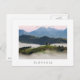 Postcard of the church of St. Thomas (Sveti Tomaž) on a hill surrounded by morning fog in the countryside of Slovenia near Skofja Loka during a pink sunrise with Alps mountains in the background with a white border and the text: 'Slovenia'.