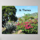 Gorgeous view of tropical flowers and plants on the U.S. Virgin Island of St. Thomas. A peek at the blue water and mountain with houses are in the background. Words: "St. Thomas" is written on scene.