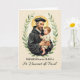 A devotional greeting card honouring the Feast Day of Saint Vincent de Paul, the Catholic priest known for his charity, humility, and tireless service to the poor and sick. This design features a watercolor portrait of Saint Vincent de Paul gently holding a child, framed by a delicate leafy wreath. The warm, encouraging message reflects his compassionate heart and lifelong dedication to works of mercy.