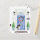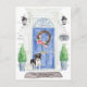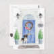 Announce your new address with our stylish announcement featuring a Stabyhoun, blue front door, welcome mat, slate sign, topiaries and a floral wreath set on a grey brick background.
