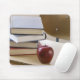 Stack of books, apple, and school desk mouse pad