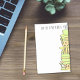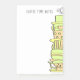 This notepad features a white background which sets off pastel colours in a stack of whimsical coffee cups. The black outlined cups are filled in with a colouring book or cartoon style. Fill in the template field with your message, remove either/both text group/s or click customise to select a typeface style, size, and colour you like.