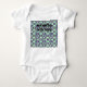 This baby bodysuit has a mid-century modern design of rectangles stack three thick in cool colours of blues, greens, and purples on a field of white. Want the same design with different colours? Message me.