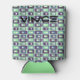 This can cooler has a mid-century modern design of rectangles stack three thick in cool colours of blues, greens, and purples on a field of white.