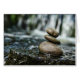 A trio of smooth rocks stacked by a small pond's waterfall.