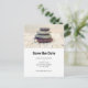 Save the date postcard with a photograph featuring rocks stacks on top of each other. Surrounded by loose white rocks and little white flowers.