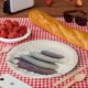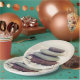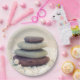 Paper plates with a photograph featuring rocks stacks on top of each other. Surrounded by loose white rocks and little white flowers.
