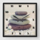A clock with a photograph featuring rocks stacks on top of each other. Surrounded by loose white rocks and little white flowers.