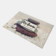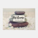 A welcome doormat with a photograph featuring rocks stacks on top of each other. Surrounded by loose white rocks and little white flowers.
