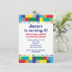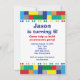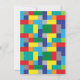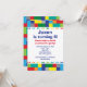 A fun colourful border of plastic stackable bricks. Personalise this invitation for a boy's toy theme birthday party.