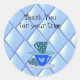 A cute design featuring colourful stacking teacups on a blue diamond background. Says 'thank you for your time', change message as desired.