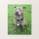 Pictured sitting waiting for treats is a Staffordshire Bull Terrier