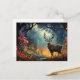 A magnificent stag, with a 6-tine rack of antlers, pausing in a forest clearing to look at the viewer. The small field, surrounded by a thick grove of trees, is filled with an amazing array of red, pink and, yellow wildflowers.