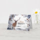 A beautiful watercolor illustration featuring a woodland setting which has fir trees in the distance and snow covered pine leaves and cones in the foreground which form a border around templates that may be personalised. A single majestic stag with beautiful antlers is standing in the left corner and has pretty berries above and around him. The inside has the same decorative elements with a further template for your custom greeting to friends, family and loved ones.
