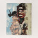 In a swirl of dust, a group of Wild West adventures staves off pursuit as their stagecoach barrels across the dusty desert. A native american woman handles the horses but looks over her shoulder to check on the others. Meanwhile, a woman in a dress leans out of the coach pointing a six shooter at whomever chases them. Atop the racing vehicle stands the man in black, wearing a black hat, a face scarf and a coat that flaps in the wind. With a smoking pistol in each, he ready for a gunfight.
