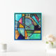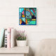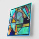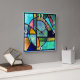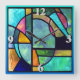 10.75” x 10.75” acrylic wall clock with an image of blue, pink, yellow and green stained glass arranged in an abstract pattern.