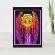 A dramatic stained glass angel, in vibrant jewel colours with a golden halo, announcing the advent of Christmas.