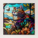 This stunning stained glass design features a cat sitting among flowers, watching a butterfly.