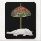The artist's cat Beau sleeps peacefully under the stained glass desk lamp in this painting by Carolyn McFann of Two Purring Cats Studio.