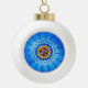 A beautiful round stained glass design made with different shades of blue and a sun in the centre.