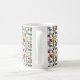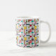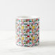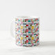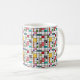 This mug has a mid-century modern design of a grid of black lines with squares and rectangles in retro colours on a field of white.