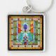 Large square premium metal keychain with an image of a stained glass fantasy created with red, orange, yellow, green, blue, aqua and pink stained glass with a floral design, dotted with luminous green orbs and deep red crystal orbs. See matching square double-sided acrylic keychain, square button, square charm, square necklace and wrist watch. See the entire This & That Keychain collection in the ACCESSORIES section.