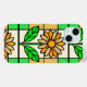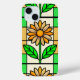 a stained glass window illustration of a yellow and white daisy with green leaves.