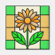 a stained glass window illustration of a yellow and white daisy with green leaves.
