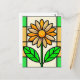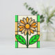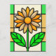 a stained glass window illustration of a yellow and white daisy with green leaves.